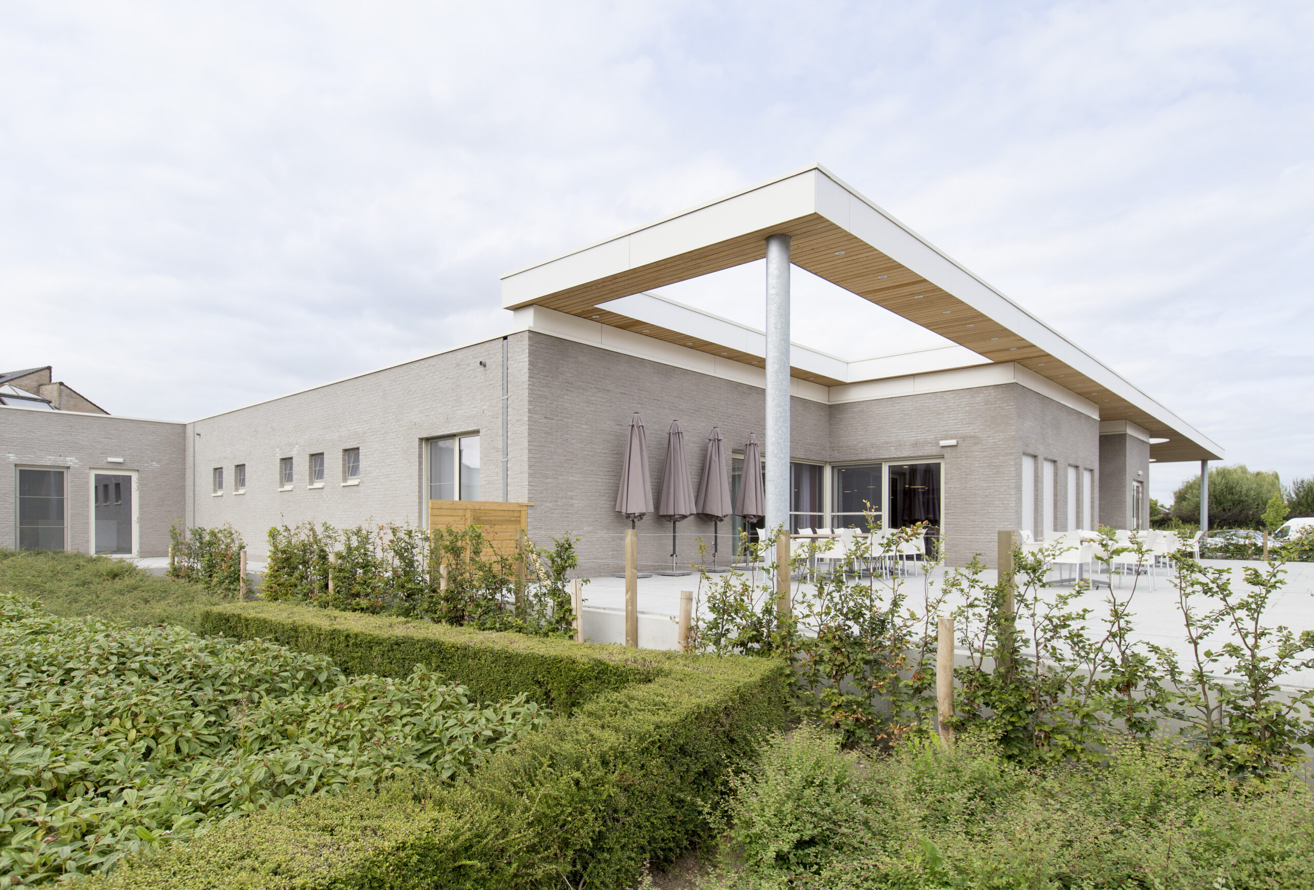 Het dagverzorgingscentrum is een uitbreiding aan het bestaande woonzorgcentrum, maar krijgt een eigen identiteit binnen deze wooncampus. Langsheen de toegangsweg naar de hoofdinkom, ontwerpen we een gelijkvloers volume waar het contact met buiten in de verf wordt gezet. Een ruime kiss-and-ridezone voor het gebouw maakt een vlotte toegankelijkheid mogelijk. De strakke luifel begeleidt mensen naar de inkomzone van het dagverzorgingscentrum. Hierdoor kunnen mensen vlot en droog het centrum elke ochtend bereiken.