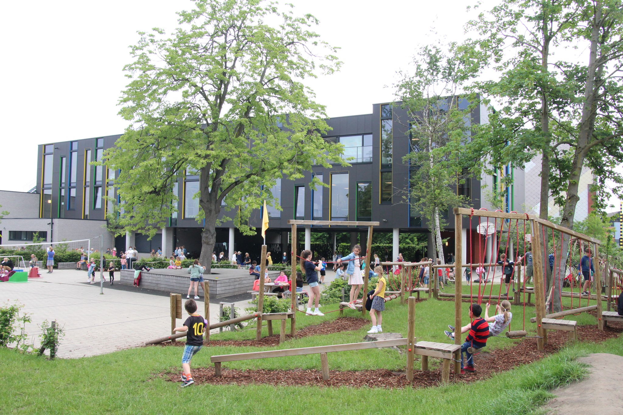 Tussen het gedeelte van de kleuters en de lagere school op de gelijkvloerse verdieping hebben gemeenschappelijke functies zoals refter, keuken, turnzaal en de administratieve voorzieningen hun plaats. Door de lagere school gedeeltleijk zwevend te organiseren, wordt er tegelijk in een overdekte speelplaats voorzien. Het ontwerp en de inrichting van de omgeving vertrekt eveneens vanuit de gebruikers, met verscheidene zones aangepast aan de doelgroep die meerwaardes meekrijgen om de zintuigen te prikkelen.