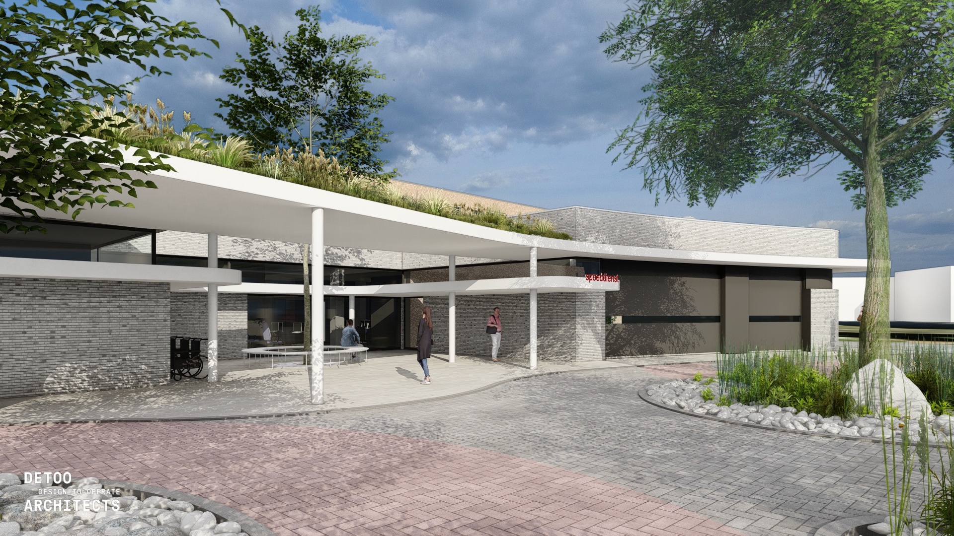 Architecturale Eenheid en Materialisatie Om rust en samenhang te creëren op de site, is er bewust gekozen voor een uniform architecturaal taalgebruik. De nieuwe volumes en de bestaande spoedafdeling zullen worden bekleed met hetzelfde witte gevelmateriaal (gevelsteen of plaatmateriaal). Hierdoor smelten de verschillende functies — van de spoed tot het toekomstige dagziekenhuis — samen tot één krachtig, wit monolithisch geheel, in lijn met eerdere uitbreidingen in wit architectonisch beton.