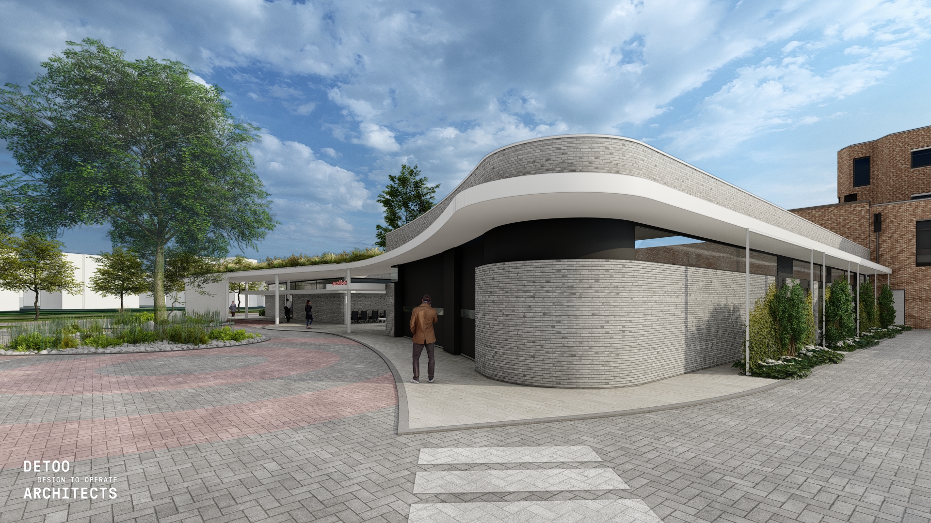 Inplanting en Omgeving De uitbreiding situeert zich logischerwijs aan de achterzijde van het perceel, ingeklemd tussen de Diestersteenweg en de spoorlijn. Ondanks deze drukke ligging staat de beleving van de bezoeker centraal. Het verlies aan parkeerplaatsen door de uitbreiding wordt gecompenseerd op nabijgelegen campussen, waarbij een nieuwe ‘groene’ wandelweg de bezoekers op een aangename manier naar de inkom begeleidt. Ook is er aandacht voor buitenruimte via een binnenplein voor patiënten en een afgescheiden zone voor personeel.