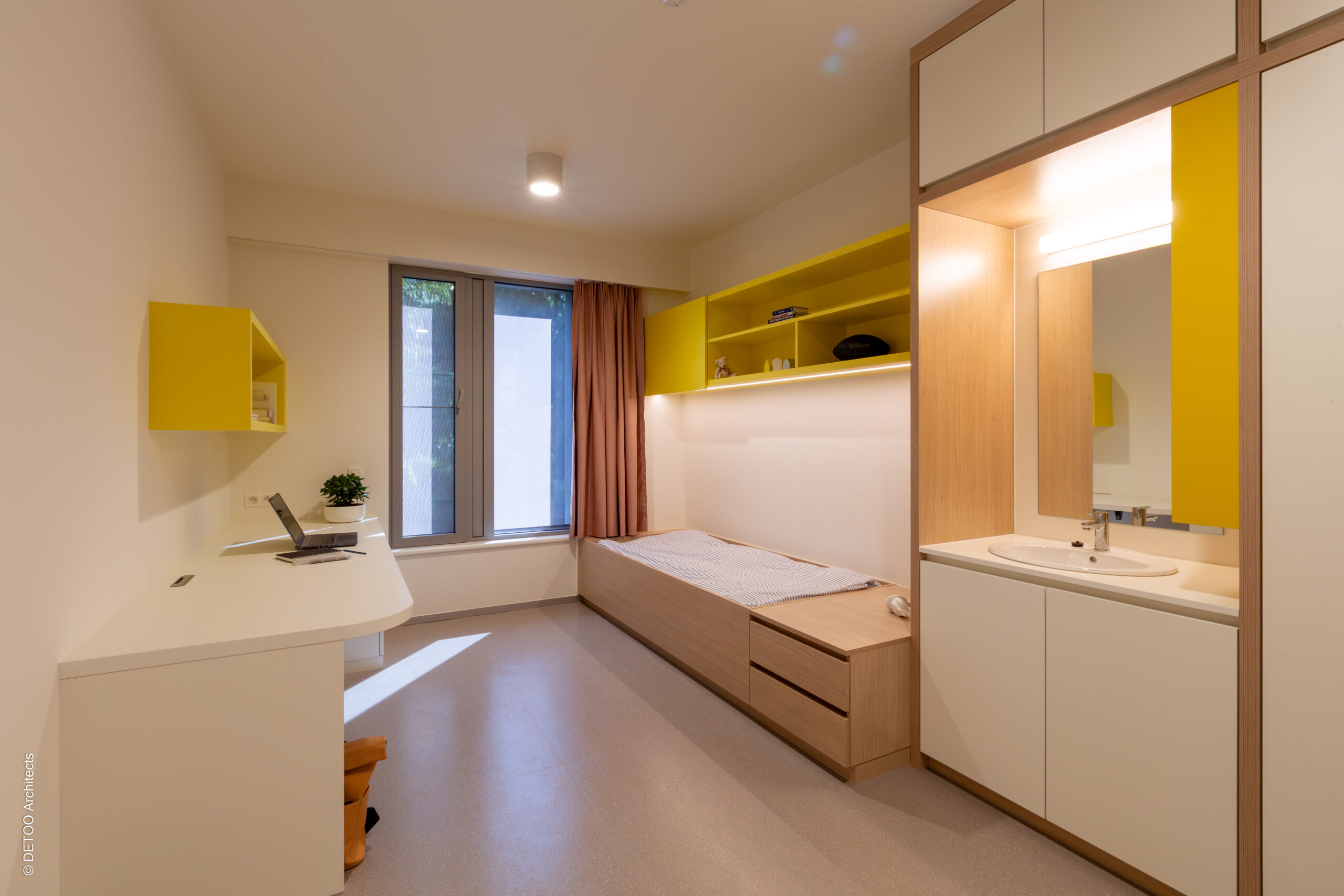 Het grondplan van beide paviljoenen werd symmetrisch opgebouwd, met alhoewel gegroepeerd in één bouwvolume, de leefgroepen toch volledig van elkaar gescheiden. Vanuit pedagogisch standpunt worden de beide paviljoenen ruimtelijk wel voldoende gespreid ingeplant tov elkaar.