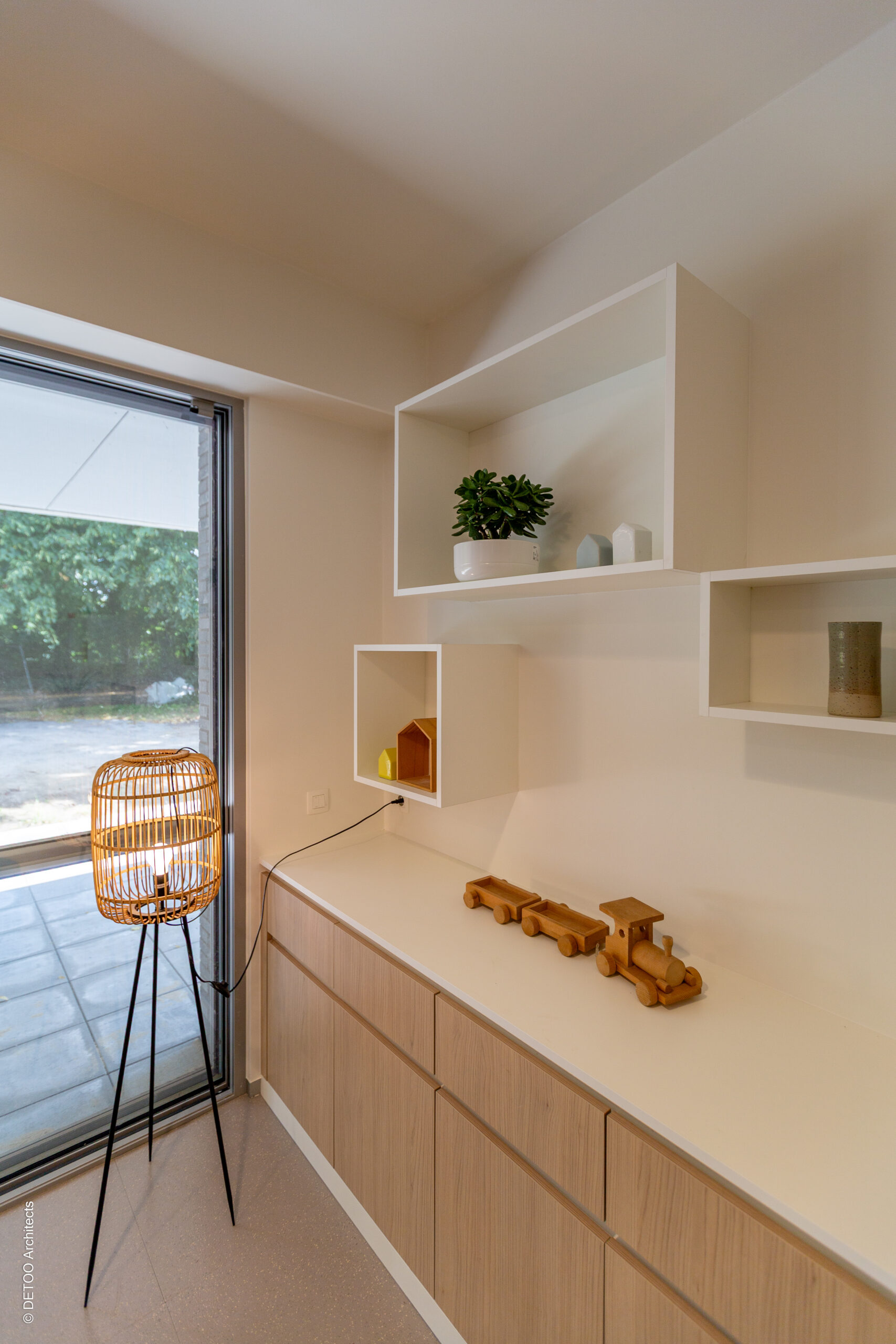 Het gelijkvloers omvat centraal -visueel en fysisch van de twee leefgroepen afgescheiden- ontvangstruimtes en burelen waar de medewerkers van de dienst derden kunnen ontvangen en interne besprekingen kunnen voeren, zonder dat toegang moet worden verleend aan de resp. leefgroepen. Op de 1e verdieping bevinden zich de 2x 12 slaapkamers voor de residenten met centraal tussen de beide vleugels/leefgroepen de lokalen voor begeleider, de comfortruimtes en de centrale lift.