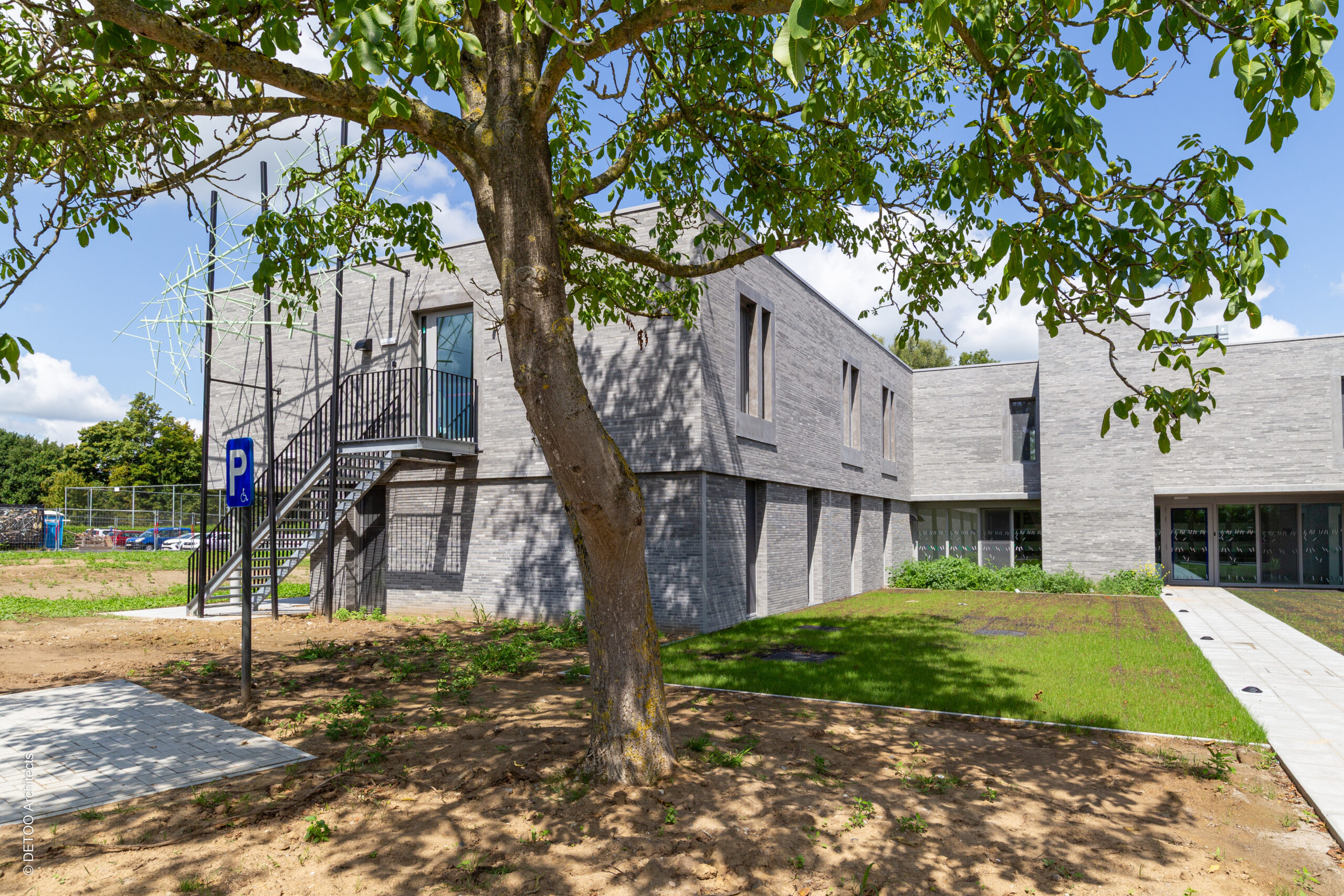 Bij de inplanting werd volop ingezet op een integratie in het bestaande groene kader van de site. Dmv nieuwe aanplantingen van bomen, lage struikbeplanting en gemengde hagen worden de tuinen van de paviljoenen afgescheiden van elkaar.