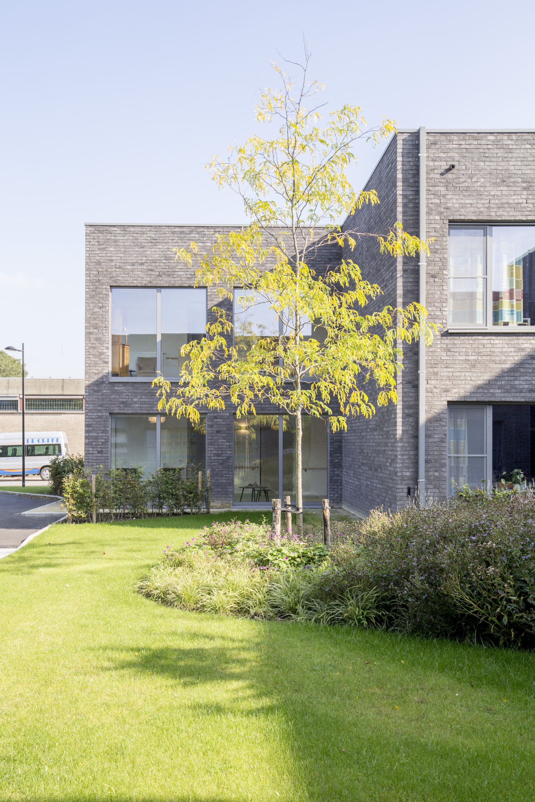 Dat volume grenst zowel westelijk als zuidelijk aan de brandweg, die toegang verschaft tot de bestaande parking van het WZC alsook de kiss & ride en nieuwe parking van de vervangingsnieuwbouw. De materialisatie van de gevels bestaat aldus uit een combinatie van de bakstenen en beton. Het betonnen volume dat tussen de hoofdnieuwbouw en uitbreiding gesitueerd is, zorgt niet alleen voor een contrast tussen die twee volumes maar ook voor een evenwicht dat zich ritmisch verder zet d.m.v. de aluminiumramen.
