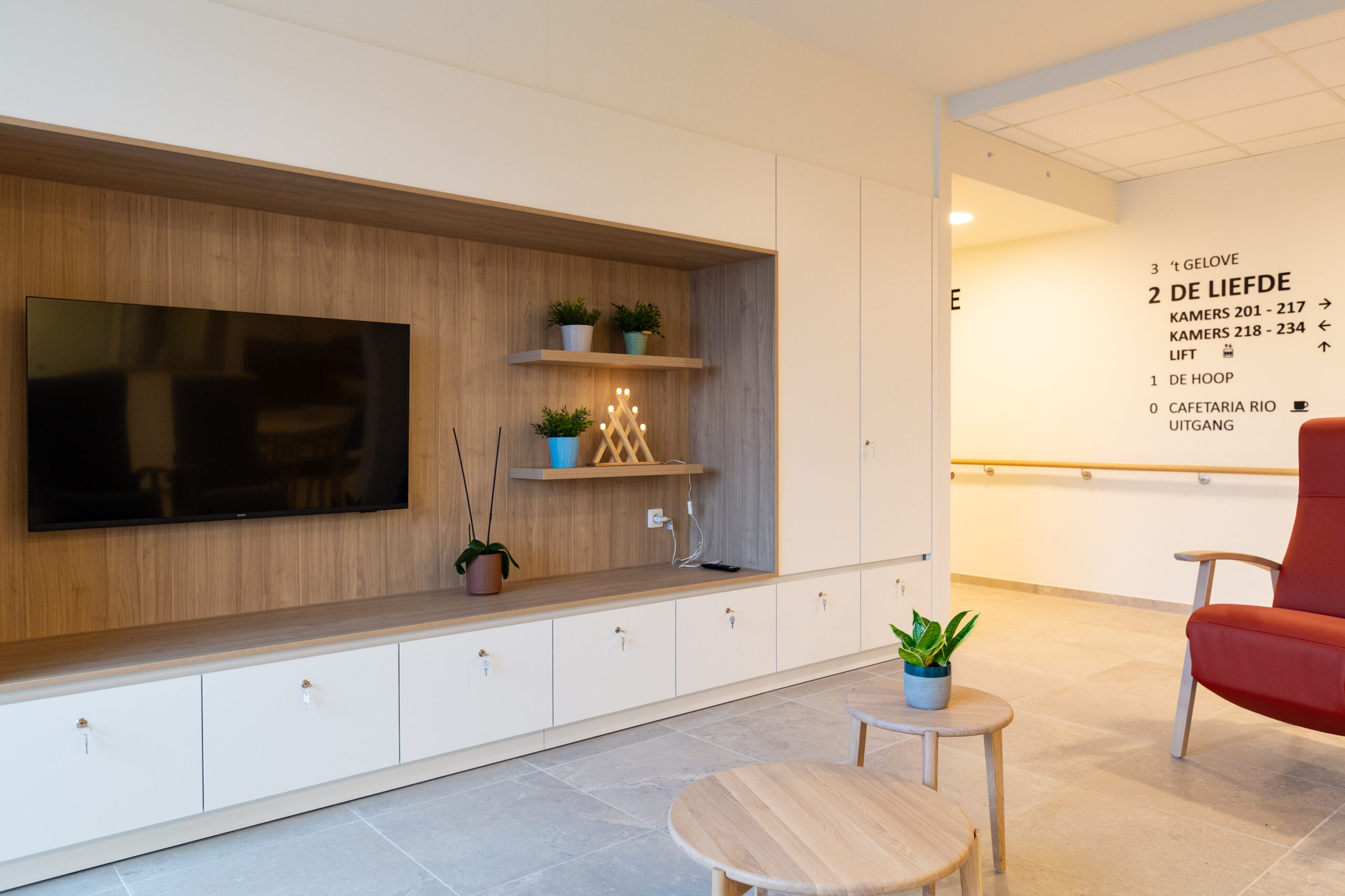 In de gangen van de leefgroepen zijn er telkens per 4 kamers kleine pleintjes gecreëerd ter hoogte van de toegangsdeuren. Deze insprongen in de gang bevorderen de leesbaarheid en maakt het gemakkelijker voor de bewoners om zich te oriënteren in de gebouwvleugels. Op de buitenhoeken van de gangen zijn er voor de bewoners per leefgroep telkens twee informele zithoeken voorzien met zicht op de stad Tielt of de groene buitenruimtes.